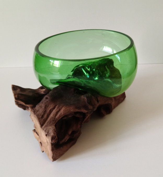 Belle contenance pour cette coupe, ce qui vous permettra un usage varié: petit terrarium, saladier, coupe à fruits, ...Les idées ne manquent pas. Dimensions en cm: Diamètre ouverture 16,5 - Hauteur totale 15 - Bois flotté 23X22